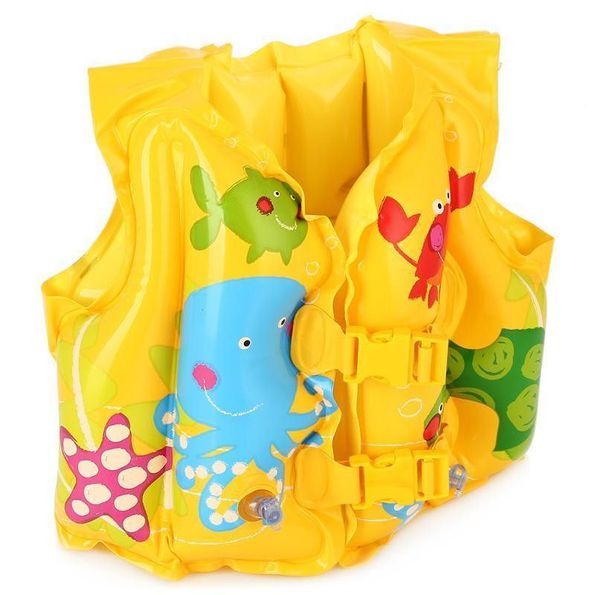 Flytvästen är i färgstark gul och har gulliga motiv från havet som sjöhäst, fiskar och sjöstjärna.
