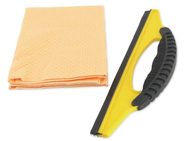 Fönsterrengöringsset som innehåller en skrapa och en fönsterduk.