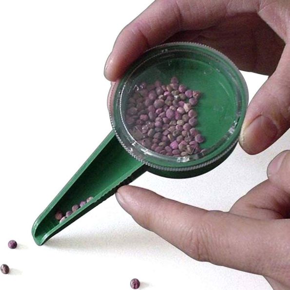 Frödispenser för enklare sådd av fröer. En mycket användbar frö-dispenser som underlättar vid plantering och hantering av fröer. Det finns flera olika storlekar på de reglerbara hålen i dispensern och den fungerar till de flesta frötyperna. Perfekt när du planterar då du enkelt kan fylla upp dosan och sedan klicka ut ett och ett frö i raderna eller plugg-brätten. Pipen är räfflad så att det är enklare att plantera.