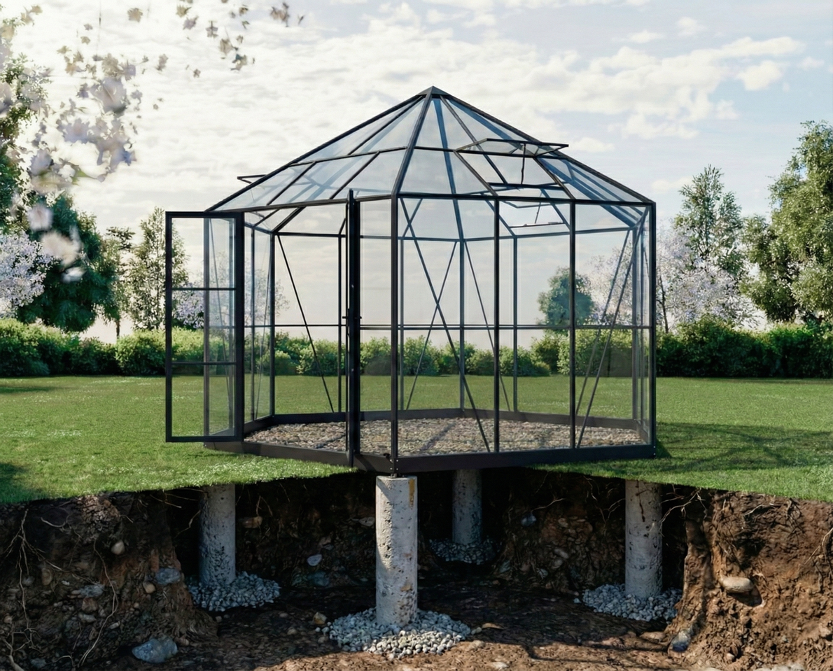 Det 10 cm höga, svartlackerade fundamentet levereras med nedgjutningsbara järn. Montering på sockel är det enklaste sättet och dessutom gör den att växthuset blir mer stabilt. Det går givetvis bra att bygga/mura en egen sockel.