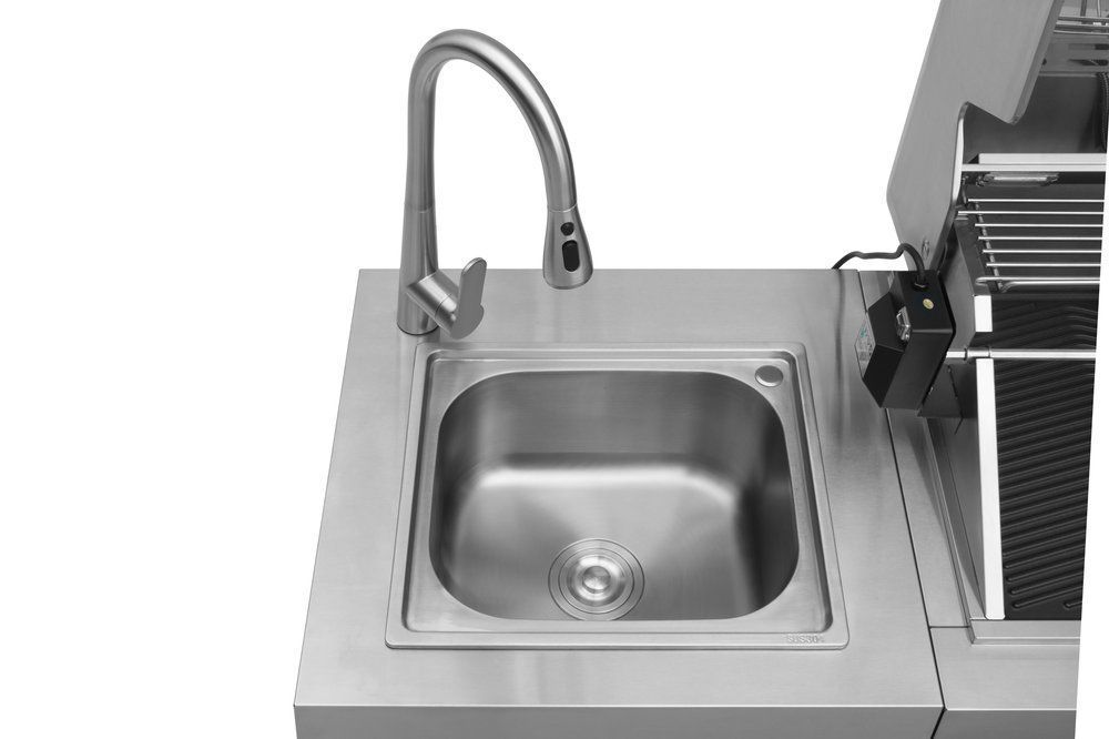 Grillen är helt igenom av rostfritt stål och vackert upplyst. Det finns gott om förvaringsutrymme för grilltillbehör eftersom grillen har tre skåp och tre utdragbara lådor. Grillen har också ett belyst kylskåp, samt en vattenkran och ett diskställ. Mustang Ametist har alltså i stort sett allt man behöver i ett fungerande sommarkök.