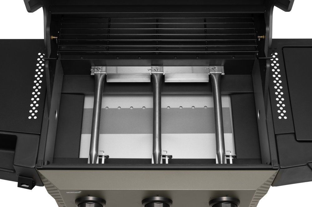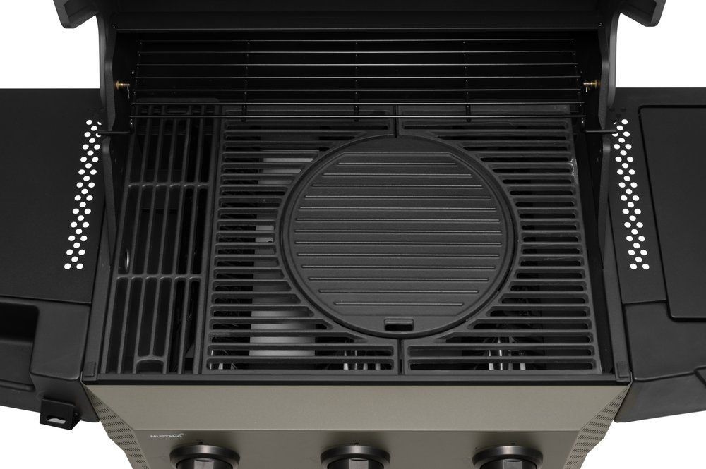 Grillen levereras med ett grilljärn i matt gjutjärn med en diameter på 30 cm. Grillens dubbla lock, sidopaneler, vagn och skåpdörrar i pulverlackerat stål. 2 stora hjul för enkel förflyttning av grillen.