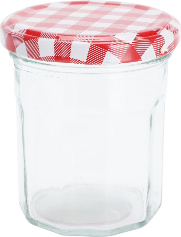 Syltburk i glas med snyggt lock av metall med rutigt mönster.