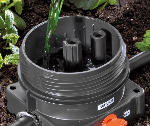 GARDENA Gödningsdispenser är idealisk när du vill lägga till GARDENA Universell Flytande gödning till GARDENA Micro-Drip-System. Den stora fyllningsöppningen och ventilen för att tömma om det blir frost, eller inför fyllning med flytande gödning, gör det särskilt enkelt att hantera dispensern. Hur mycket gödningsmedel som finns i dispensern visas med nivåindikeringen.