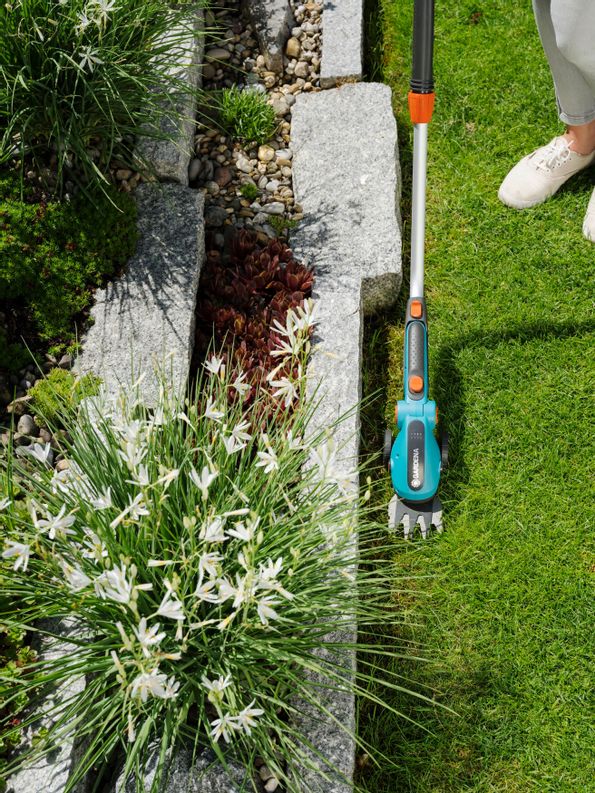 Med GARDENAs set ComfortCut Li Batteridriven grässax inklusive busktrimmer kan gräskanter klippas bekvämt och exakt. Den batteridrivna saxen kan användas för olika tillämpningar eftersom den är utrustad med utbytbara gräs- och buxbomsblad, samt buskblad. Grässaxen ligger perfekt i handen tack vare ett ergonomiskt handtag. Handtaget kan också böjas och anpassas till handens naturliga form. Kvalitetsbladen ger perfekta klippresultat och kan lossas och bytas ut med en knapptryckning, utan verktyg. Med inbyggt, lättskött litiumjonbatteri. Batteriet kan laddas snabbt när som helst, och har ingen minneseffekt. Komplett med knivskydd och laddare. Grässaxen kan eftermonteras med ett teleskopskaft för bekväm klippning av gräskanter (medföljer ej, tillbehörsart. 9859).