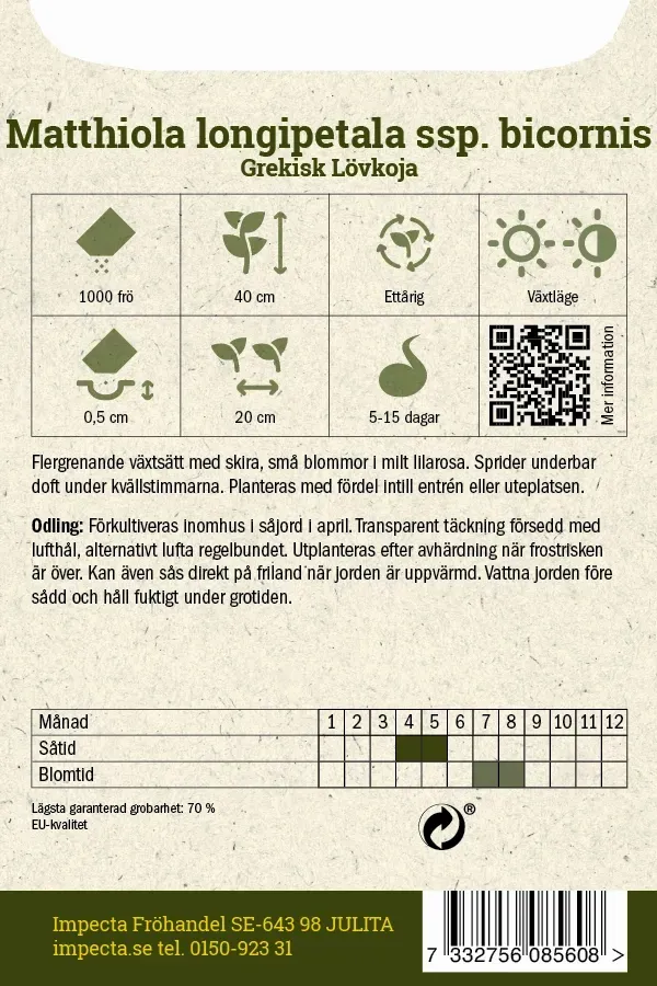 Förkultiveras inomhus i såjord april. Transparent täckning försedd med lufthål, alternativt lufta regelbundet. Utplanteras efter avhärdning när frostrisken är över. Kan även sås direkt på friland när jorden är uppvärmd. Vattna jorden före sådd och håll fuktigt under grotiden.