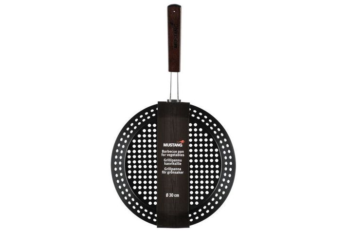 Panna i stål med non-stick-yta, vridbart handtag i hårdträ. Mustang logotyp på trähandtaget. Pannan har hål så att den heta luften som stiger från grillen tillreder pannans innehåll.
