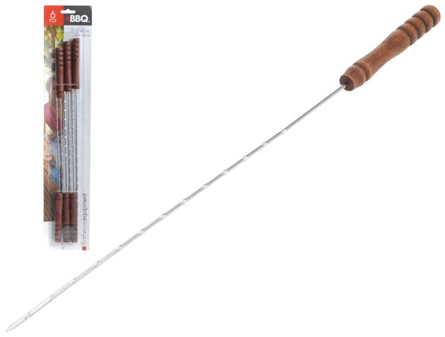 6-pack grillspett i rostfrittstål med handtag i trä.