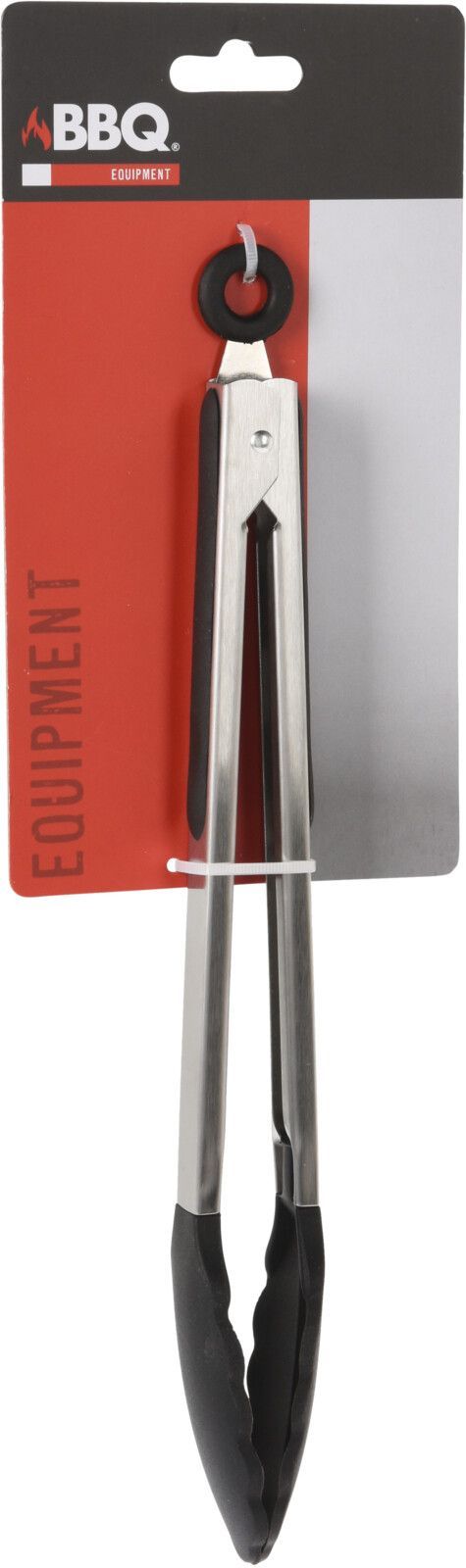 Grilltång i rostfritt stål med greppvänlig handtag och ögla för upphängning.