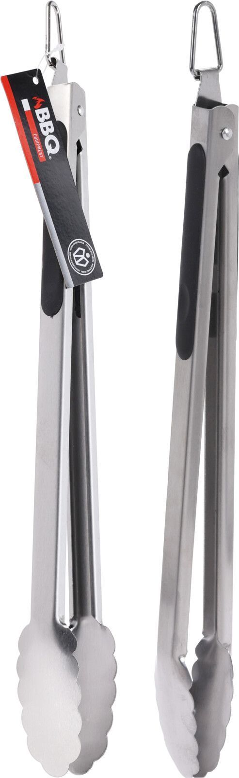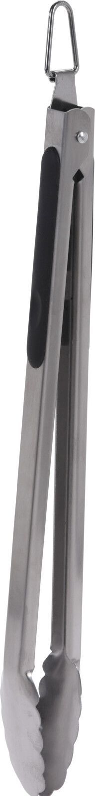 Grilltång i rostfritt stål med greppvänlig handtag och ögla för upphängning.