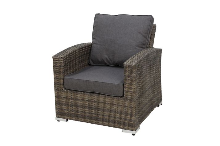 Fåtöljen har 10 cm tjocka dynor och lutning i ryggen för extra skön komfort. Dynor ingår i vattenavvisande mullvadsfärgat olefintyg.