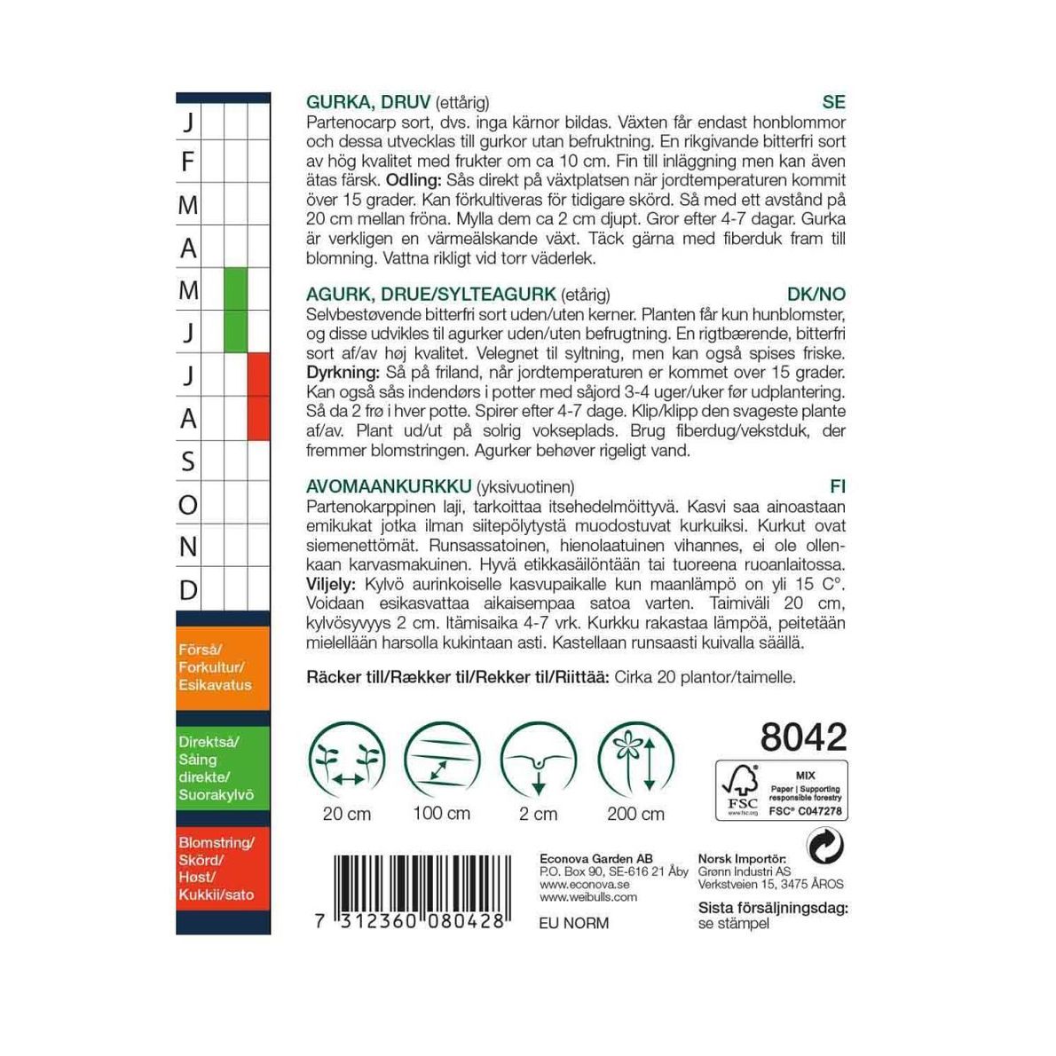 Sås direkt på växtplatsen, när jordtemperaturen kommit över 15 grader. Kan förkultiveras för tidigare skörd. Så med ett avstånd på 20 cm mellan fröna. Mylla dem ca 2 cm djupt. Gror efter 4-7 dagar. Gurka är verkligen en värmeälskande växt. Täck gärna med fiberduk fram till blomning. Vattna rikligt vid torr väderlek.