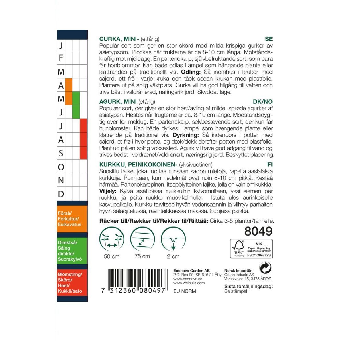 Så inomhus i krukor med såjord, ett frö i varje kruka och täck sedan krukan med plastfolie. Gror efter 4-7 dagar. Plantera på en solig, varm växtplats. Gurka vill ha god tillgång till vatten och trivs bäst i väldränerad, näringsrik jord.