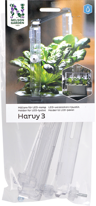 Hållare till växtbelysning LED Small (art. 5564, 39 cm) för odlingslådan Harvy 3 (art. 5541). Fästs på lådan och möjliggör därför valfri placering. Mycket enkel höjdjustering från 18 cm till 35 cm. LED-rampen fäst med sina clips i hållarens vinklade övre del. Av transparent PC/PMMA.