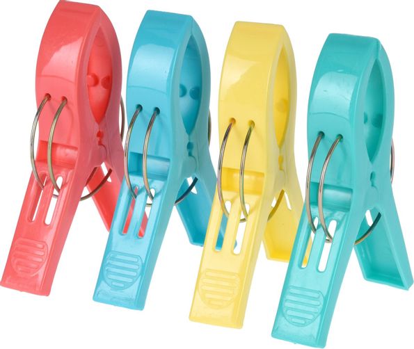 Handduksklämma i mixade färger till att säkra strandhandduken till solstolen så att den inte blåser iväg.