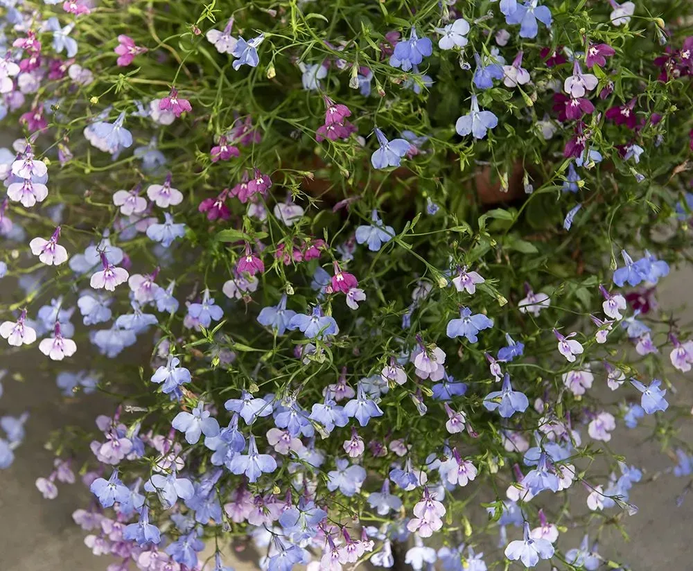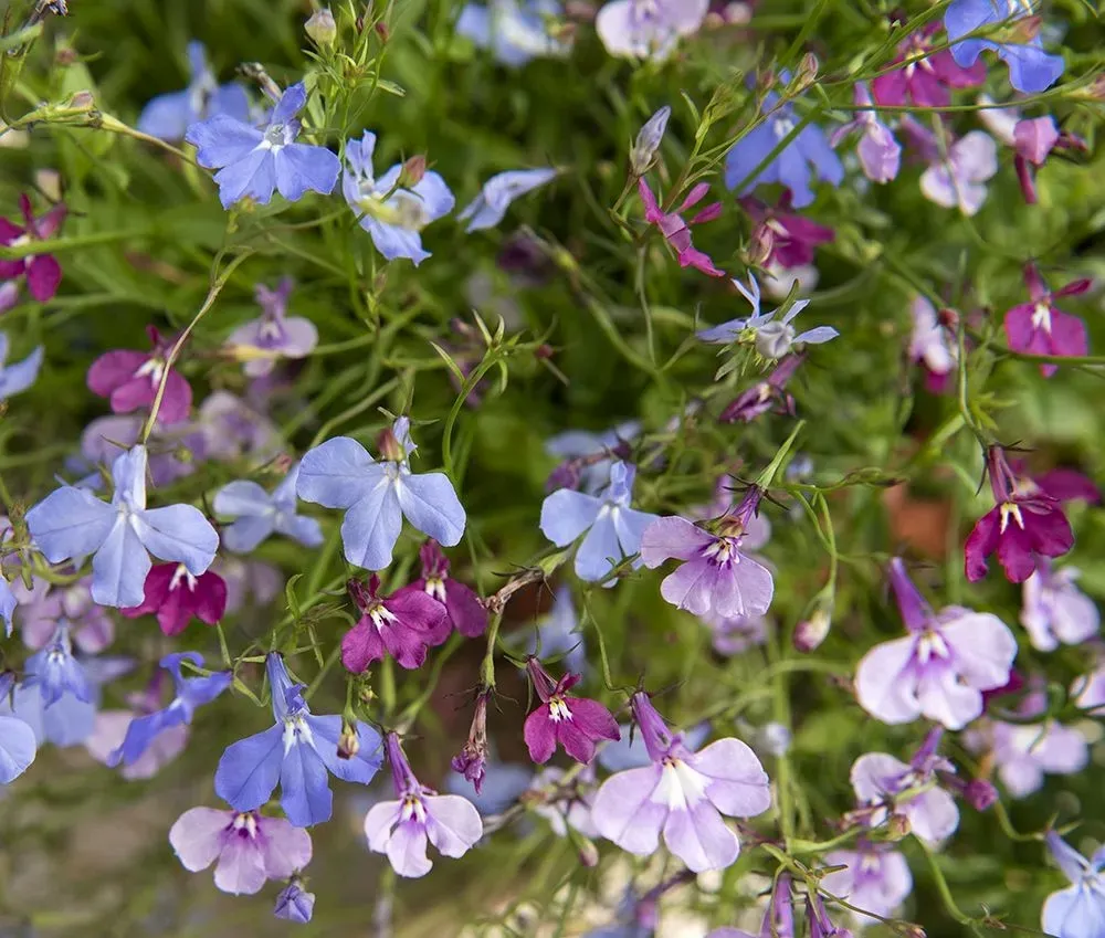 Kaskader av små blommor i en variationsrik blandning av rubinrött, syrenlila och midnattsblått med inslag av vitt. Rikblommande och omtyckt sommarblomma för amplar och blomlådor.