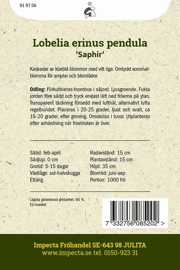 Placeras i 20-25 grader, ljust och svalt, ca 15-20 grader, efter groning. Omskolas i tuvor. Utplanteras efter avhärdning när frostrisken är över. Benämns även som: Kaplobelia