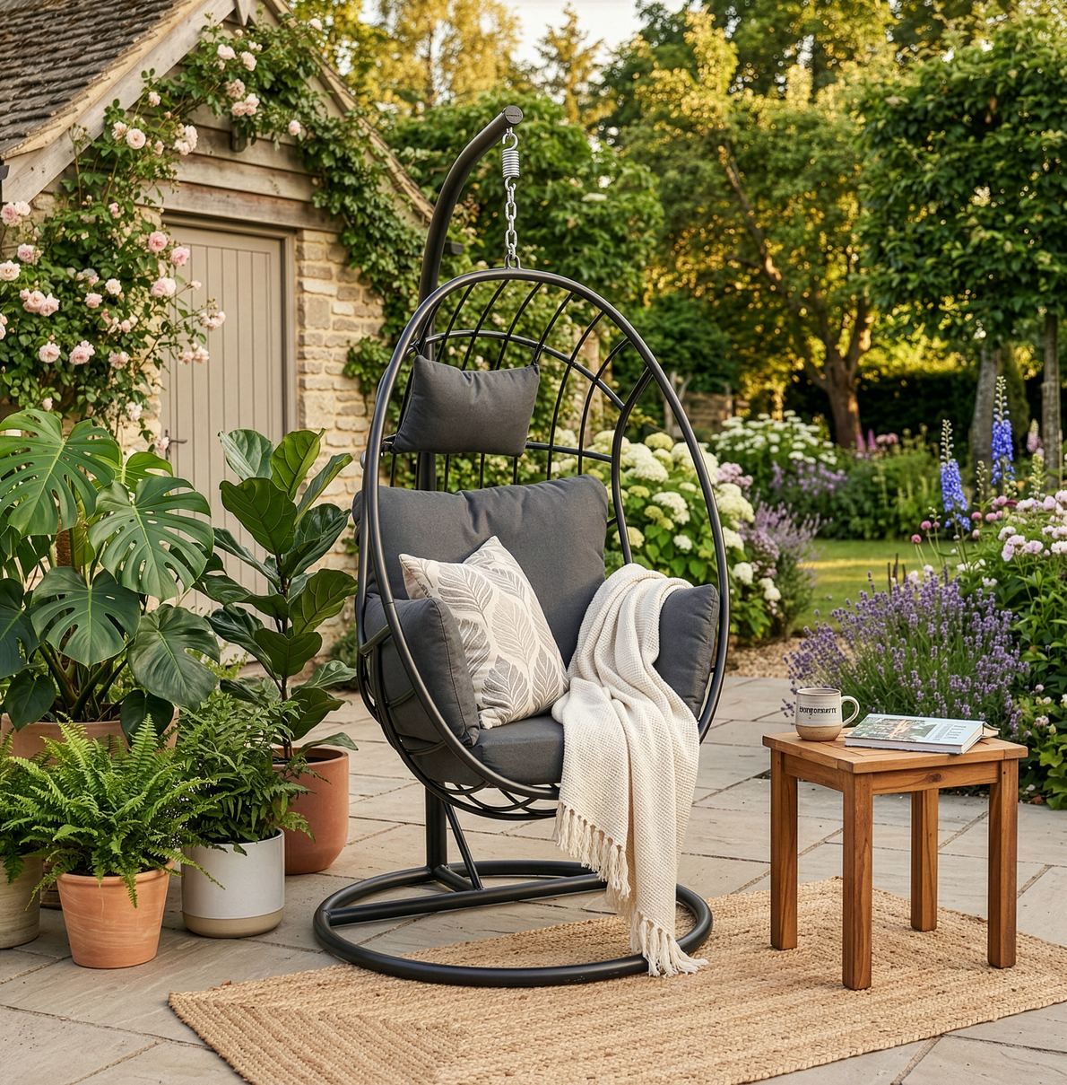 Gungans droppformade korg är tillverkad i tålig, svart pulverlackad aluminium som hänger tryggt i en tung och stabil ställning av svartlackat stål. Tillsammans med gungan får du generösa, mjuka dynor i grå polyester som gör att du bekvämt kan sjunka ner med en bra bok eller bara njuta av solen i timmar. En praktisk detalj är att korgen enkelt kan plockas av från stativet, vilket underlättar smidigt när det är dags för vinterförvaring.