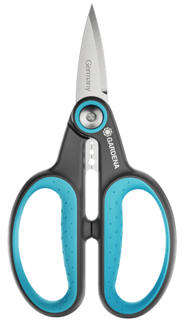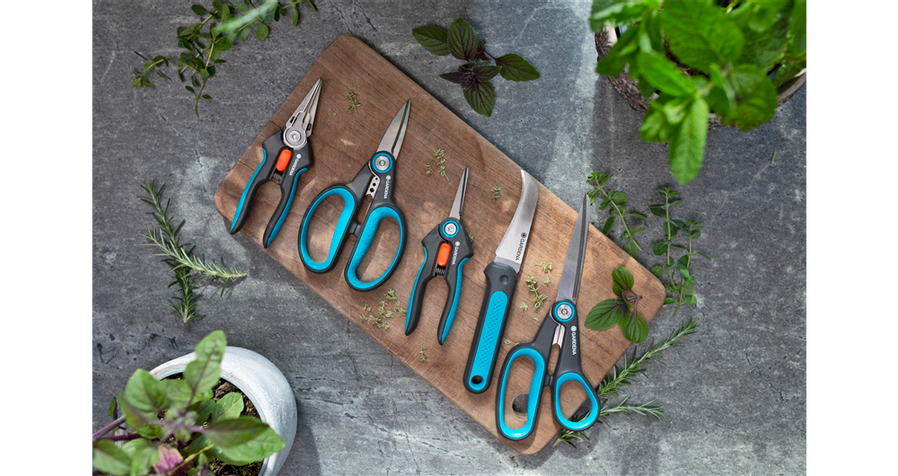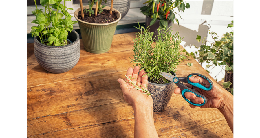 HerbCut från GARDENA skär örter som rosmarin, timjan eller salvia. De spetsiga bladen av slitstarkt och rostfritt stål gör att du kan skörda med precision. En smart detalj är de tre olika stora hålen mellan de två handtagen. Dra helt enkelt stammen genom ett hål för att enkelt ta bort bladen. På så sätt har du tagit bort bladen från örtstammen i bara en rörelse. Nu kan du direkt använda rosmarinbladen till matlagning eller lägga ut dem för att torka.
