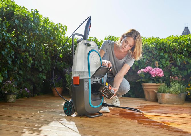GARDENAs högtryckstvätt AquaClean Li-40/60 med batteri är en mobil och tyst rengöringslösning. Den behöver inga vatten- och strömanslutningar och kan användas med stor flexibilitet. Den har en löstagbar vattentank med en volym på 14liter. För längre användning kan en slang anslutas tack vare GARDENAs integrerade slanganslutning.
