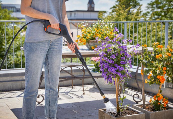Trycket kan regleras efter behov för olika tillämpningar och för skonsammare rengöring av olika ytor. Funktionen i Soft-Clean-läget garanterar maximal körtid. I paketet ingår ett 15-graders fläktmunstycke för borttagning av grov smuts och en bevattningsspruta för mobil bevattning av isolerade områden i trädgården.