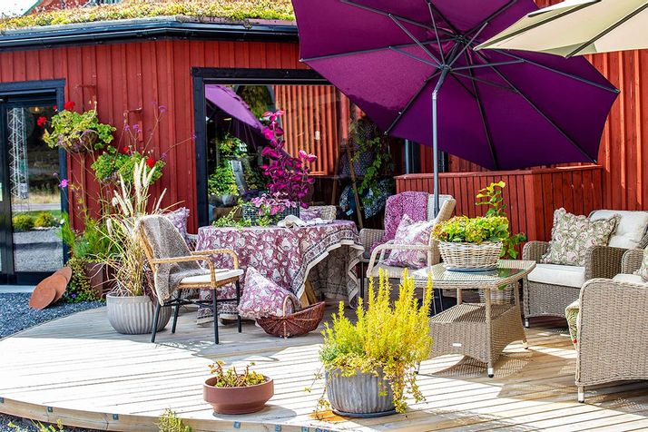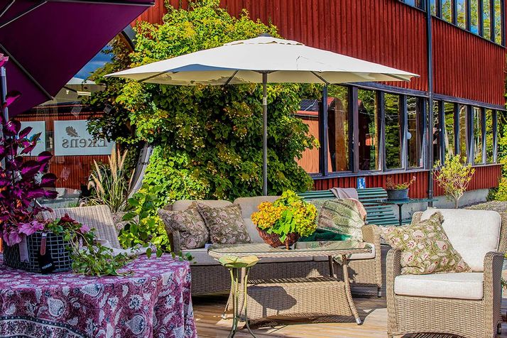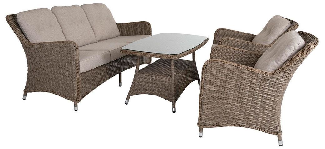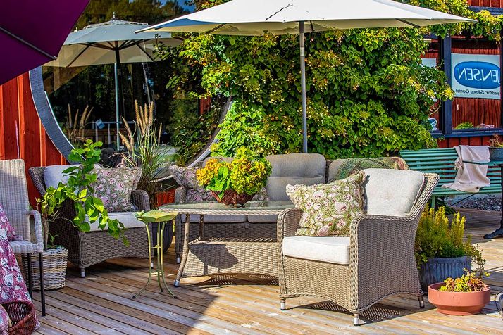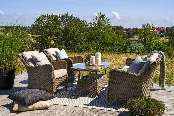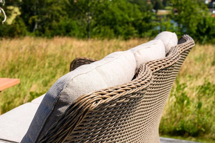 Rymlig och skön soffgrupp. Här sitter du bra ovanpå konstrottingen och de sandfärgade kuddarna. Detaljerna gör helheten och här är det de rundade hörnen och välvda stommarna som sätter den genuina känslan. Dynor ingår.