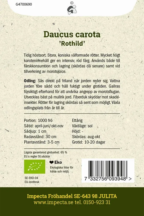 Tidig höstsort. Stora, koniska välformade rötter. Mycket högt karoteninnehåll ger en intensiv, röd färg. Används både till färskkonsumtion och lagring (skördas då senare) samt vid tillverkning av morotsjuice.Odling från frö:Sås direkt på friland när jorden reder sig. Vattna jorden före sådd och håll fuktigt under grotiden. Gallras försiktigt efterhand för att undvika angrepp av morotsflugan. Utvecklas bäst på mullrik jord. Fiberduk skyddar mot skadeinsekter. Rötter för lagring skördas så sent som möjligt. Växla odlingsplats från år till år.Portionsmängd: 1000 fröUtvecklingstid, dagar: 75Växtläge: solFärg: OrangeSåtid: april-juni/okt-novGrotid: 10-20 dagarBlomtid/Skördetid: aug-oktÅrighet: Ettårig