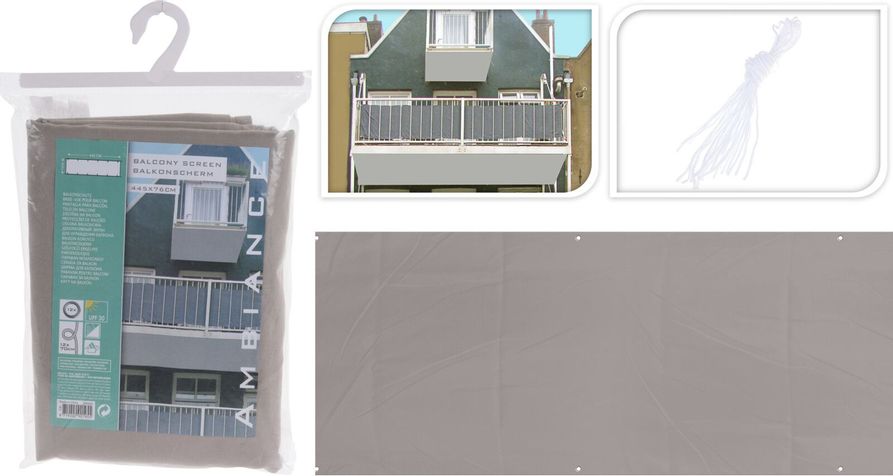 6 öglor i övre och 6 i nedre kant för att fästa i räcket. Snören ingår.