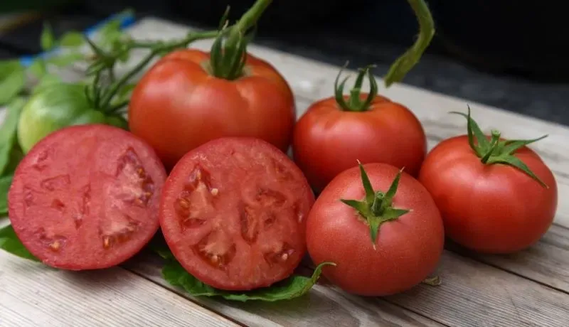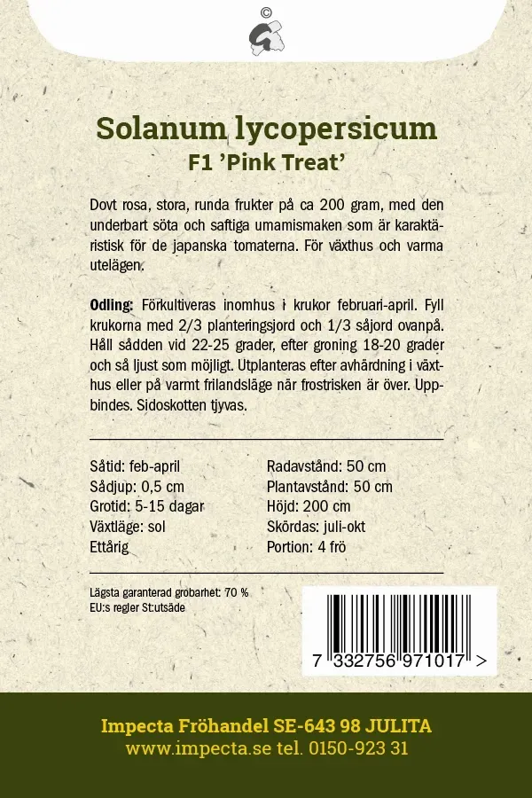 Japansk Tomat. Dovt rosa, stora, runda frukter på ca 200 gram, med den underbart söta och saftiga umamismaken som är karaktäristisk för de japanska tomaterna. För växthus och varma utelägen.