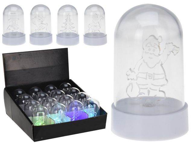 Glaskupa med olika julmotiv i. Med LED-belysning i olika färger.