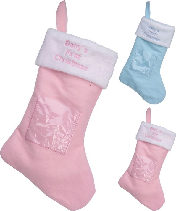 Söt julstrumpa i filt, med texten ”Baby´s First christmas”.