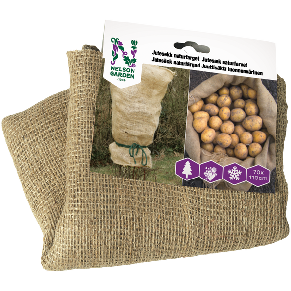 Jutesäck för övertäckning av växter. Skyddar mot såväl frost och snö som stark sol, men även mot uttorkning om våren. Kan även användas som krukskydd, vedsäck, förvaring av grönsaker och tomtesäck till jul. 70 x 110 cm