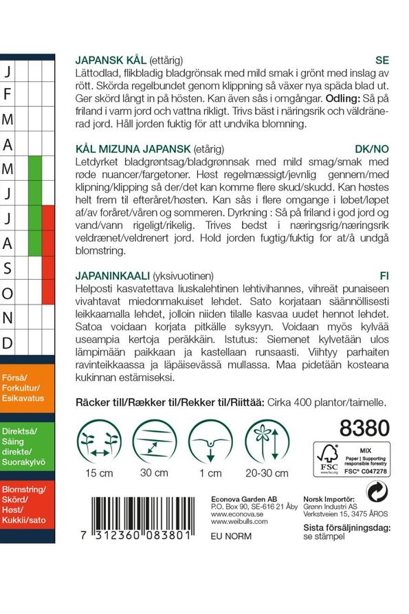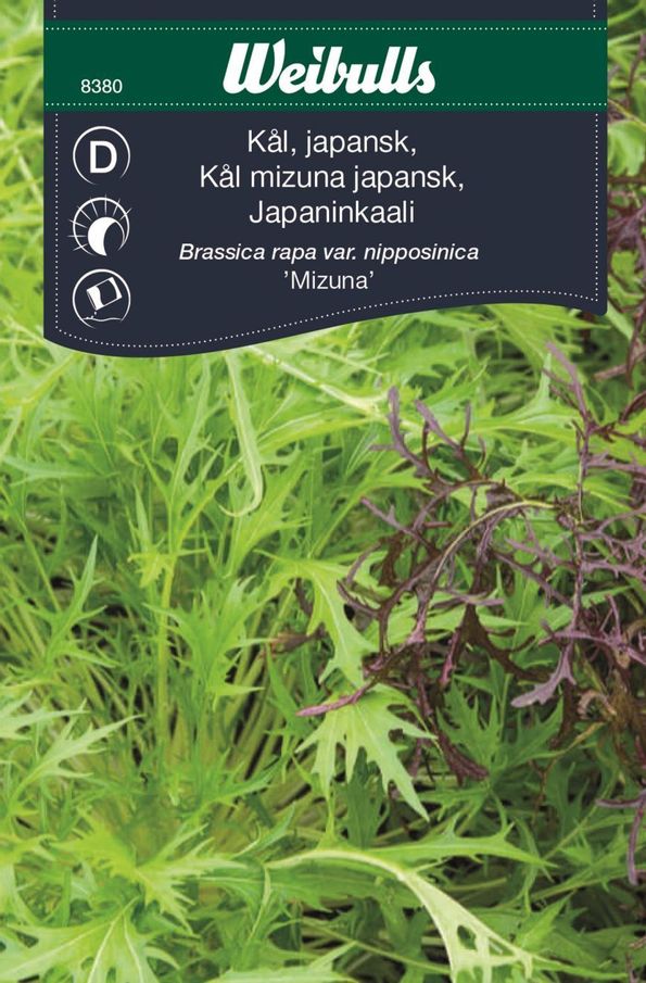 Lättodlad, flikbladig bladgrönsak med mild smak i en mix av grönt och rött. Bladen liknar Rucola till utséendet men är mildare och krispigare. Skörda regelbundet genom klippning så växer nya späda blad ut. Ger skörd långt in på hösten. Milda vintrar kan den skördas tills dessa att snön lägger sig. Kan med fördel sås i omgångar på växtplatsen. Blad och stjälkar kan ätas färska, lätt kokta eller wokade.Så på friland i varm jord och vattna rikligt. Trivs bäst i näringsrik och väldränerad jord. Gallra tidigt för bra tillväxt. Håll jorden fuktig för att undvika blomning. Om den odlas för små blad så rekommenderas avstånd på 5 – 10 cm. För större, fyllda plantor krävs 25 – 30 cm mellan plantorna.Kan även odlas inomhus året runt i kruka på fönsterbrädan. Ger färskt tillskott av bladgrönt även under vinterhalvåret. Så i omgångar. Mizuna innehåller antioxidanter och är rik på C- & A-vitamin samt folsyra och järn. I Japan utgör Mizuna en av 41 sorter som är basen för vegetarisk matlagning.Mer informationArtikel nr: 8380Såperiod: Maj-AugVäxtsätt: FriståendeHöjd: 30 cmPlantavstånd: 20 cmRadavstånd: 40 cmPlanteringsdjup: 1 cmNamn: Brassica rapa var. nipposinicaPeriodskörd: Juli-OktRäcker till: Ca. 400 plantor