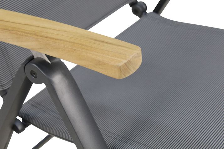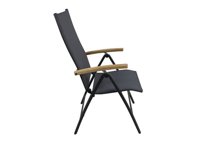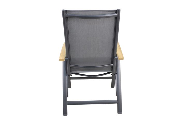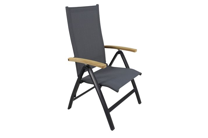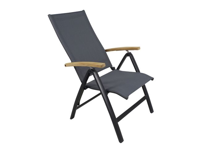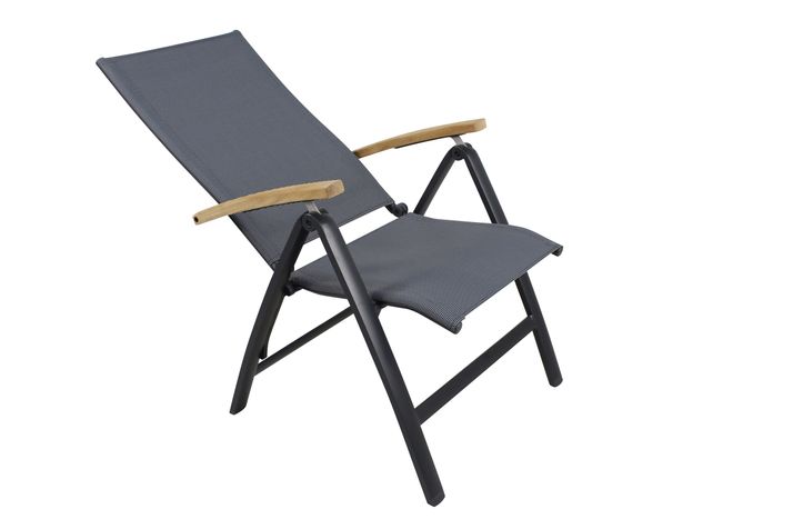 Trevlig positionsstol tillverkad i pulverlackerad antracitgrå aluminium med gråmelerad texteline och armstöd i trä.