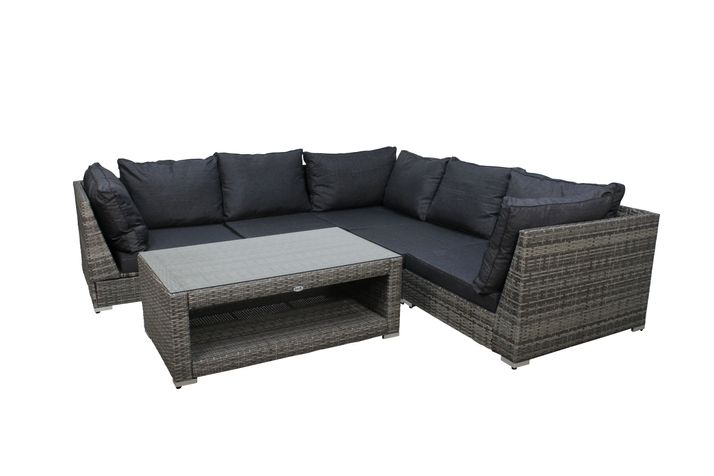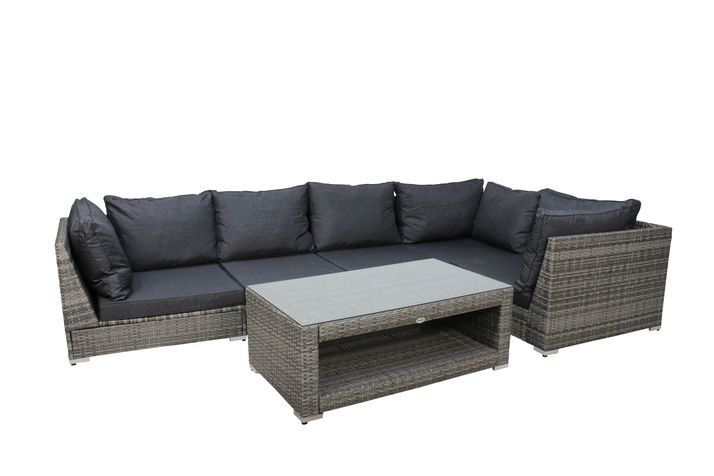 Gruppen har 10 cm tjocka dynor och lutning i ryggen för extra skön komfort. Dynor ingår i mörk granitfärgad polyester och är vattenavvisande.