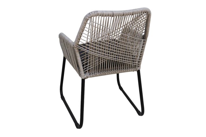 Stolen är tillverkad i 5 mm, rund, gråfärgad, slitstark konstrotting. Stommen är av kraftig svartlackerad aluminium. Sittdyna ingår i vattenavvisande, mörk granitfärgad polyester.
