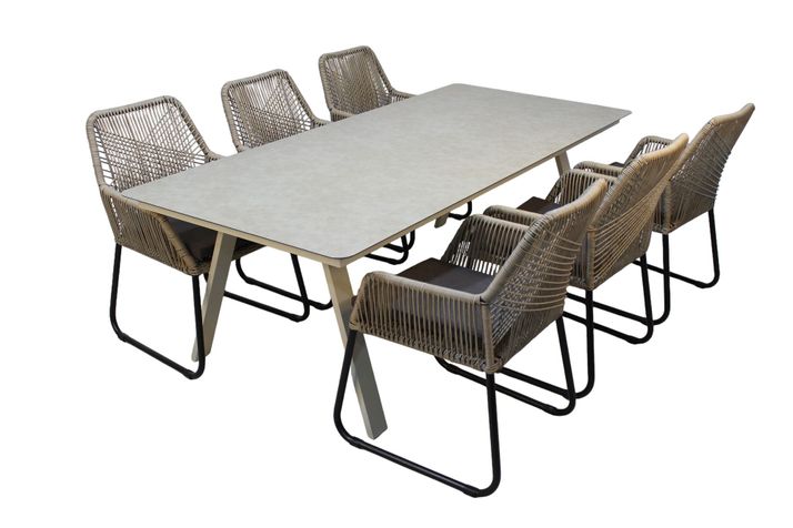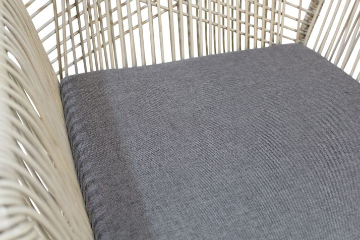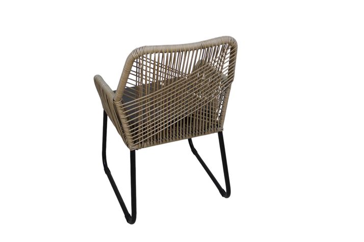 Stolen är tillverkad i 5 mm, rund, naturfärgad, slitstark konstrotting. Stommen är av kraftig svartlackerad aluminium. Sittdyna ingår i vattenavvisande, mullvadsfärgat olefintyg.