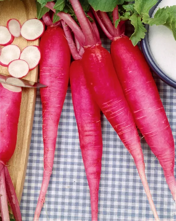Kulturarv. Från 1700-talet. Rosaröda, 15-17 cm långa, fina rötter. Vitt, krispigt fruktkött med mild, kryddig smak. Används färsk eller tillagad. Bra för vinterlagring.