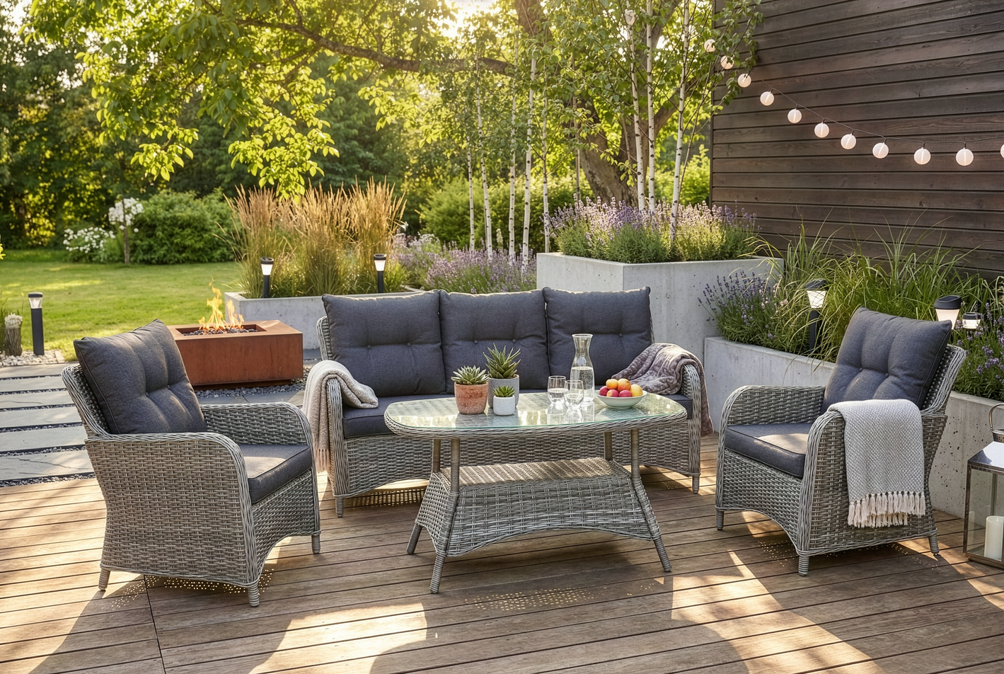Bordsskivan är i transparant, temporerat glas. Gruppen har 10 cm tjocka dynor och lutning i ryggen för en skön komfort.