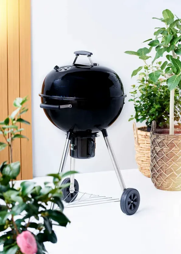 Det första du ser är den stiliga svartemaljerade metallytan. På toppen sitter den traditionella termometern och handtaget. Locket är tillverkat av robust stål av hög kvalitet, vilket ger en fantastisk värmeöverföring. När kolen är klar kan du njuta av de 79 cm arbetshöjden, samtidigt som du tillagar köttet på gallret.