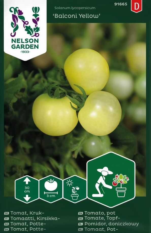 Kruktomat 'Balconi Yellow' är en 30 centimeter hög körsbärstomat. Plantan är mycket kompakt med mörkt gröna blad. Frukterna är ljust gula, avlånga i formen och avslutas med en liten spets. Frukten utvecklas snabbt och tomaterna är härligt smakrika med frisk och söt arom. 'Balconi Yellow' ger en stor och tidig skörd. Första tomaten kan skördas redan 70 dagar efter utplantering. Sorten behöver inte tjuvas. Kruktomat 'Balconi Yellow' är framtagen för odling i kruka inomhus, på balkong eller på altan. Den kan även odlas i Harvy. En tomat att njuta av hela året! Vid odling inomhus trivs den bäst i ett ljust och soligt fönster. Vintertid behöver den extra belysning. Ifall plantan ska stå på ett litet utrymme går det att påverka plantans storlek med storlek på kruka. I en mindre kruka blir plantan mindre. Den kan även beskäras för att hållas liten. I en större kruka blir plantan större. Vid odling i växthus kan 'Balconi Yellow' placeras framför högre tomatsorter för att utnyttja utrymmet maximalt. Vattna och ge flytande näring regelbundet. Plantan trivs bäst på en solig och skyddad plats. Egenskaper Latinskt namn: Solanum lycopersicum Plantans höjd: 30 cm Kännetecken: Utomhus Såmetod: Förodling Färg: Gul Mer information Växtläge: Sol Plantavstånd: 40 cm Radavstånd: 40 cm Sådjup: 0.5 cm Förodling: januari – december Skördetid: januari – december Räcker till: 3-4 plantor Förodling Denna sort kan odlas inomhus i kruka året om, använd extra växtbelysning vintertid. Använd såjord till fröna och håll sådden fuktig. Täck gärna sådden med plast eller ställ i minidrivhus så håller sig jorden fuktig längre. Den optimala såtemperaturen är 18-21°C. När plantorna tittat upp, ställ dem på en ljus och svalare plats för att få knubbiga och välmående plantor. Använd gärna extrabelysning, det förhindrar att plantorna blir långa och gängliga. När plantorna kan hanteras och har fått sina första karaktärsblad (bladpar nummer två) är det dags att plantera om dem i en lite större kruka. Vänta inte för länge med omplanteringen, det är nu de behöver en mer gödslad jord för att klara av en kraftig tillväxt. Sätt en planta i en 7 till 10 centimeter stor kruka fylld med gödslad jord (till exempel blomjord). Små plantor är känsliga och vid omplantering mår de bäst av att hanteras genom att hålla i bladen och inte i stjälken. Eftersom tomater kan bilda nya rötter längs med hela stjälken kan plantorna sättas djupt i nya krukan, då stimuleras tillväxt av nya rötter. Eventuellt kan plantorna behöva en extra omplantering innan de sätts på sin slutgiltiga växtplats. Vid utplantering, vänta tills lägsta nattemp är +8°C.