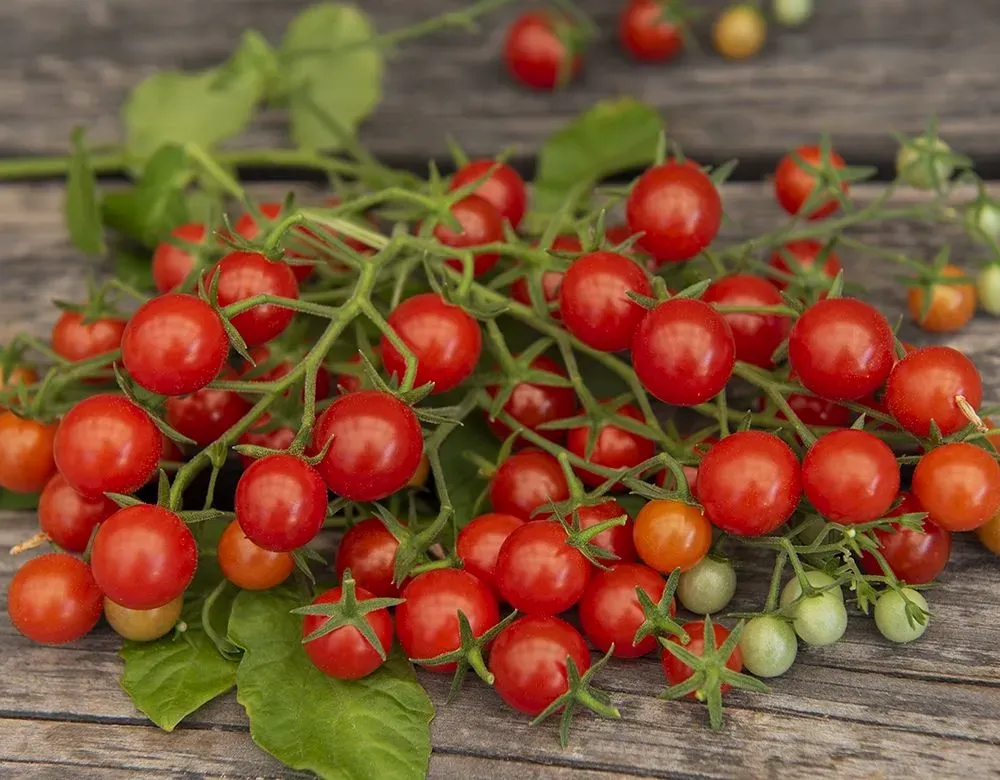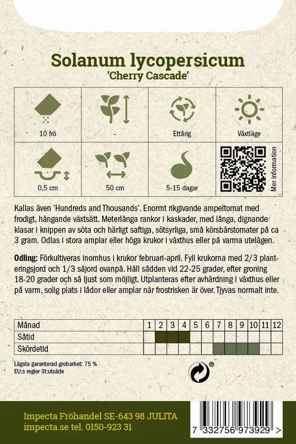 Enormt rikgivande ampeltomat med frodigt, hängande växtsätt. Meterlånga rankor i kaskader, med långa, dignande klasar i knippen av söta och härligt saftiga, sötsyrliga, små körsbärstomater. Odlas i stora amplar eller höga krukor i växthus eller på varma utelägen.