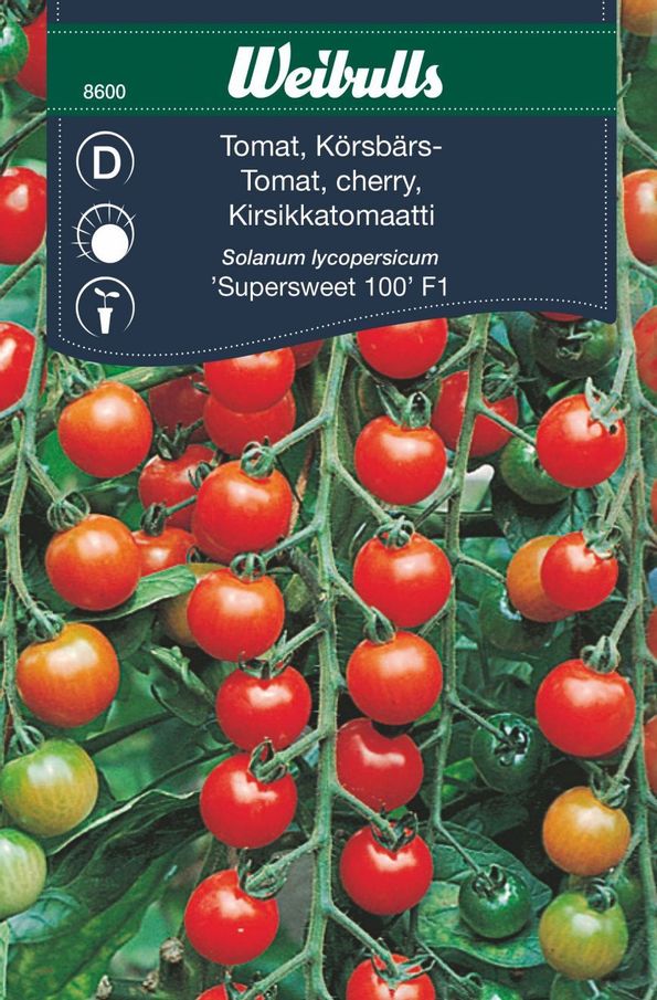 Härligt söt och god sort, som bäst odlas i växthus. Vackert röda frukter av cocktail- typ. Odling: Så inomhus i såjord i februari-april. Så grunt. Gror efter 7-10 dagar vid 20-25 grader. Hög groningstemperatur är viktig. Odla sedan svalare. Plantera om i krukor med plantjord. Odlas i växthus i stora krukor eller planterade i jorden. Bind upp plantorna och plocka bort alla sidoskott i bladvecken. Ruska lätt på blomklasen för gynnad fruktsättning. Toppa ev plantorna efter 5-6 klasar. Gödsla och vattna ordentligt. Mer information Växtsätt: Fristående Höjd: 150-200 cm Växtavstånd: 40 cm Planteringsdjup: 0,5 cm Namn: Solanum lycopersicum Periodskörd: Juli-Sep Räcker till: Ca. 10 plantor Färg: Röd