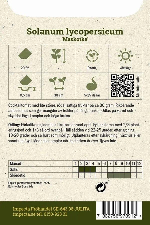 Cocktailtomat med lite större, röda, saftiga frukter på ca 30 gram. Rikbärande ampeltomat som ger mängder av frukter på långa rankor. Odlas på varmt och skyddat läge i amplar och höga krukor.