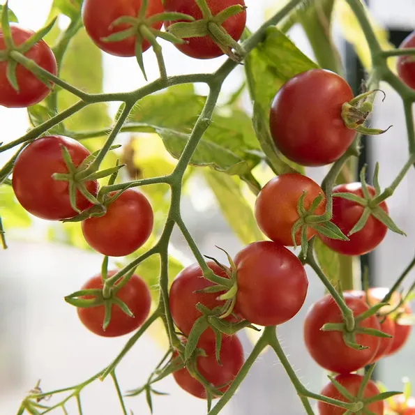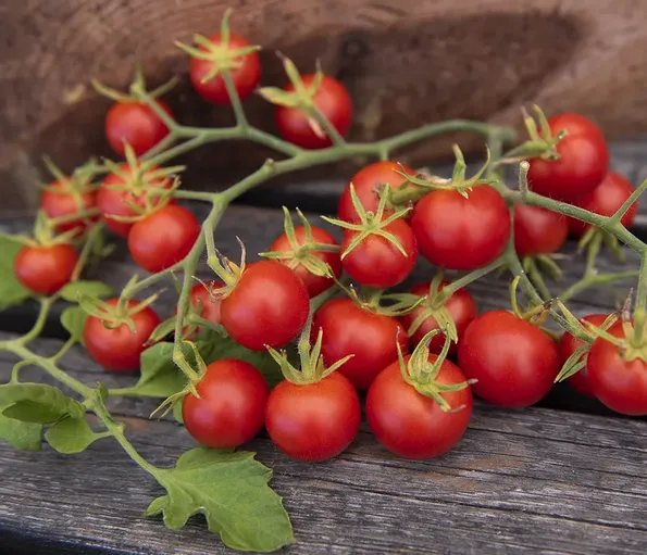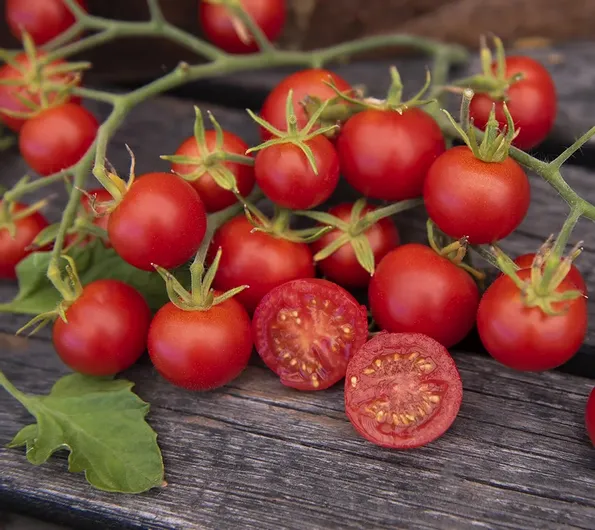 Mycket söta och saftiga, röda, runda körsbärstomater, ca 20-25 gram, på grenande knippen. Högavkastande för växthus och varma utelägen. Uppbindes.