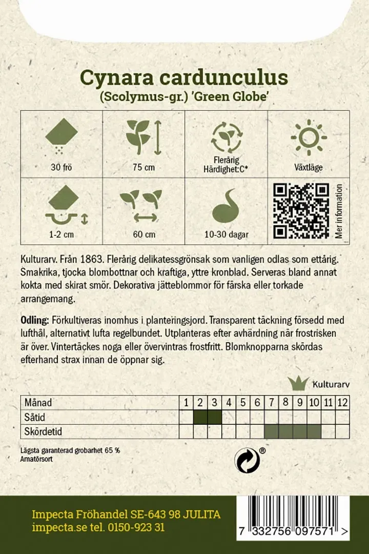 Kulturarv. Från 1863. Flerårig delikatessgrönsak som vanligen odlas som ettårig. Smakrika, tjocka blombottnar och kraftiga, yttre kronblad. Serveras bl.a. kokta med skirat smör. Dekorativa jätteblommor för färska eller torkade arrangemang.