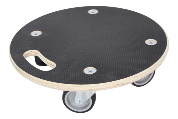 Krukhjul Tor tillverkad av 20 mm tjock plywood med antislip-beläggning på ovansidan, klarar en belastning på upp till 250 kg. Praktiskt bärhandtag för att enkelt kunna förflytta den. Mått: Ø38xH11 cm. 4 st länkhjul på Ø75 mm.