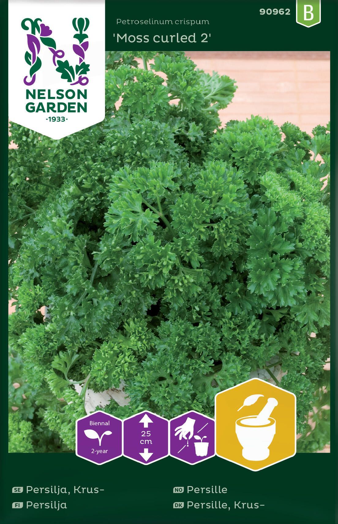 Persilja med mosskrusiga blad. Groningstid 2-4 veckor. Skördas efter hand, långt in på hösten. Går bra att frysa in. Mer information Räcker till: 6-9 m Växtläge: Sol Plantavstånd: 5 cm Radavstånd: 40 cm Sådjup: 1 cm Förodling: mars – april Förodling: För utplantering efter sista frost. Direktsådd/Plantering: Tidigt, så snart jorden går att bruka-mitten av juni. Vattna i såfåran före sådd. Håll sådden fuktig. Groningstid 2-4v. Blötläggning av fröna 2-3 dygn ger snabbare groning. Täck gärna med fiberduk. Även höstsådd.