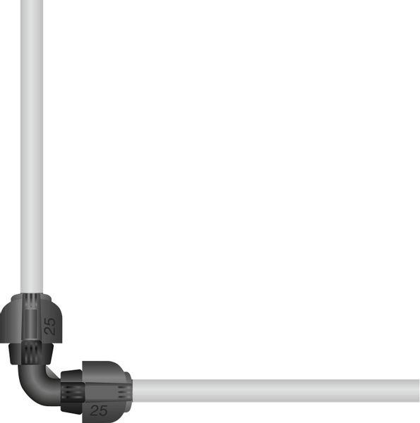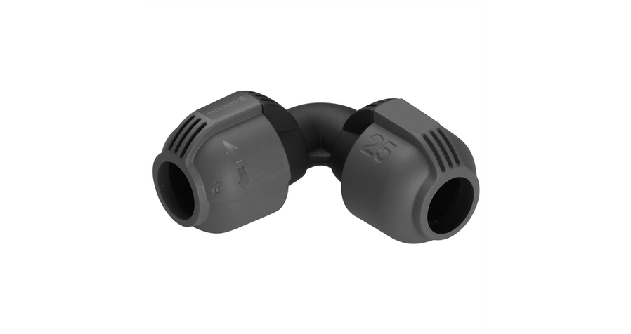 GARDENA L-skarv, 25 mm – som del av GARDENA Sprinklersystem – gör en krök på ett anslutningsrör. Den patenterade snabbkopplingstekniken gör det enkelt att, utan verktyg, montera eller demontera rör. Det är bara att vrida anslutningen 140°.