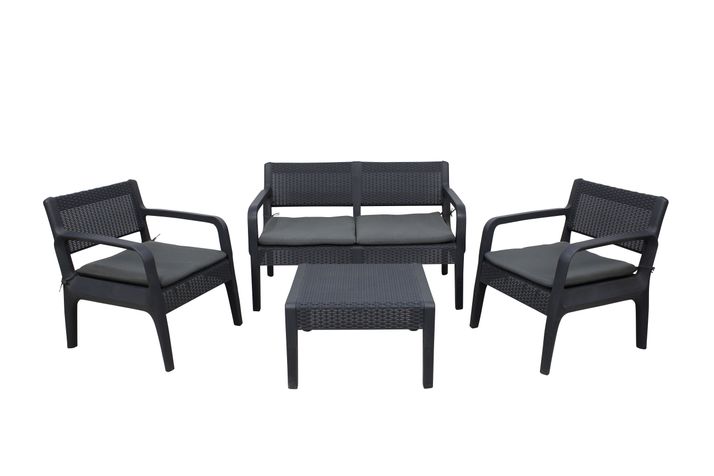 Härlig soffgrupp i formgjuten antracitgrå plast som tål både väder och vind.